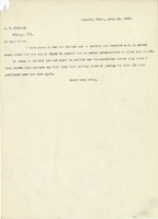 Letter, R. A. Cooley to Lawrence Bruner, 1905, Apr. 11 Typewritten letter, 1 page, from R. A. Cooley to Lawrence Bruner, "I thank you for your…"