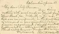 Postcard, Robert Wolcott to Lawrence Bruner, 1904, June 11 Handwritten postcard from Robert Wolcott to Lawrence Bruner, "Am doing nothing with such words…"