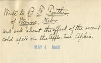 Letter, Lawrence Bruner to B.F. Feather, 1903, May 4 Handwritten note on carbon copy of letter from Lawrence Bruner to B.F. Feather, "You would greatly oblige me by letting me know…"