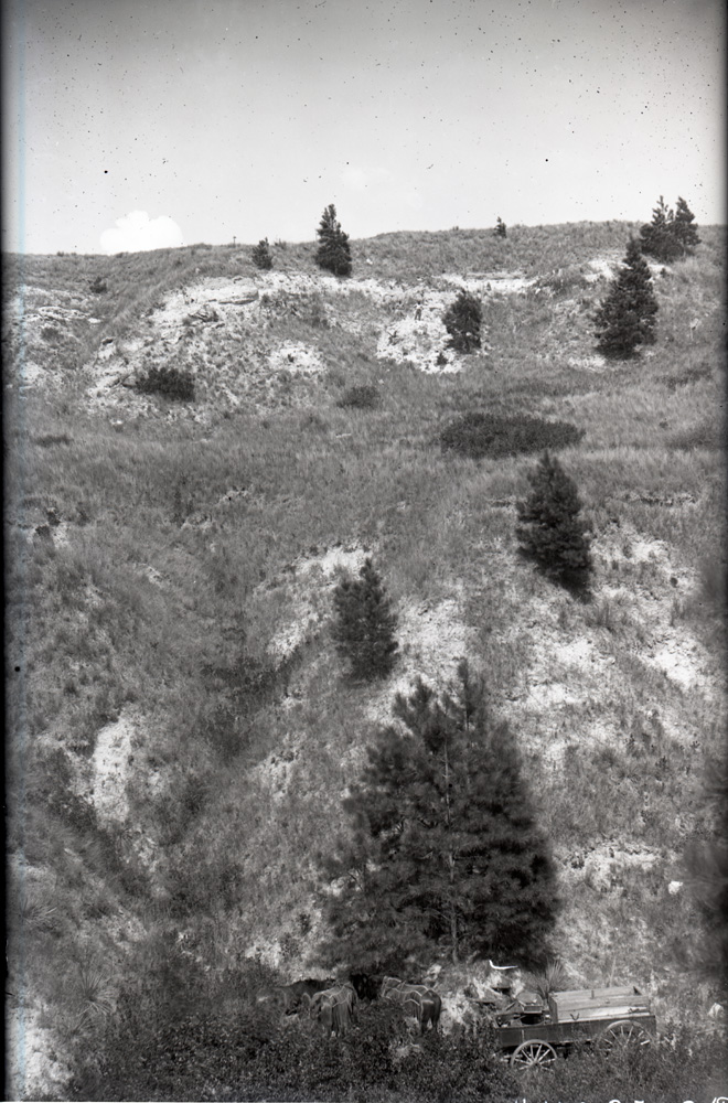 - Original caption: “Elephant Quarry. Teamsters outfit in canyon below. Location: Schlagel creek” #1150. Wagon and horses at base of ridge. Cherry County.(320101-03921)