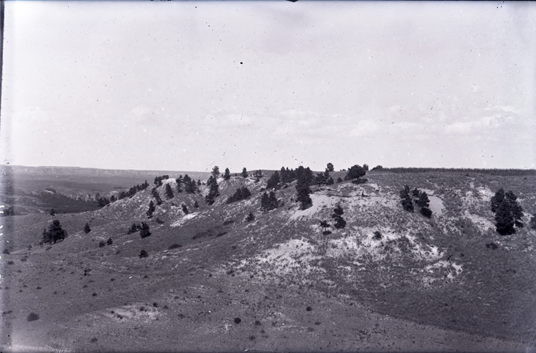 Original caption: “Rhino Quarry. Northeast. One mile SW of C & NW RR. Steel bridge crossing Niobrara Richmond on level of quarry. Extend of exposed quarry 160 ft. Fragment of cloth skull found near right hand end of quarry” #1150. Cherry County. (320101-03922)