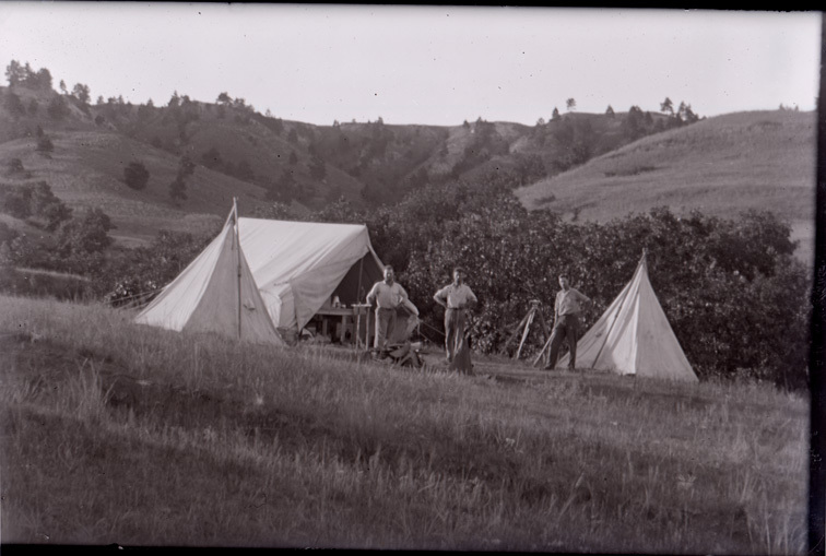 Original caption: “Camp 500 ft. SE Twin Springs. ½ mile SW Valentine bridge. Left to right, Bunnell, Hans. Richmond.” #1152. G.R. Bunnell standing at opening of middle tent. Cherry County. (320101-03927)