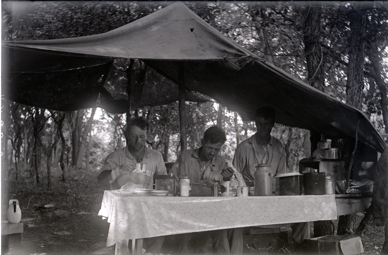 - Original caption: “Mess camp 150 ft. from Niobrara River. from left: Bunnell, Richmond and Hans” #1152. G.R. Bunnell holding cup. Cherry County. (320101-03929)