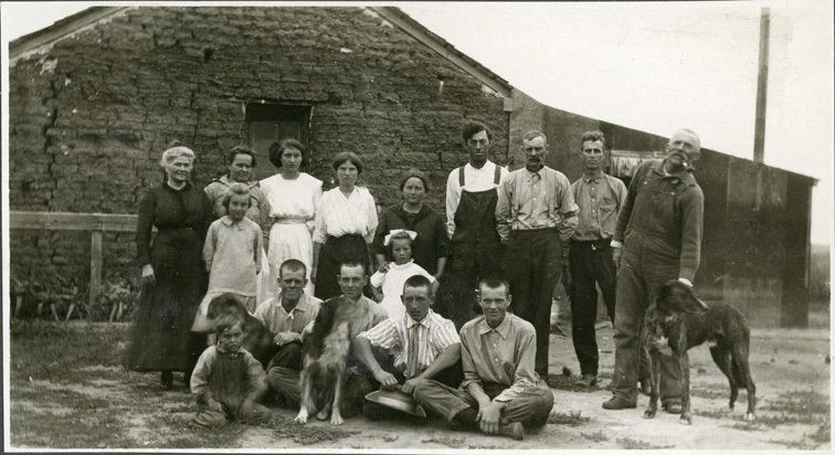 - Original caption: “Dinner party at the Dody Farm. Fred Miller on extreme right is owner of land on which Schlagel quarry is located.” #1146. Cherry County. (320101-03989)
