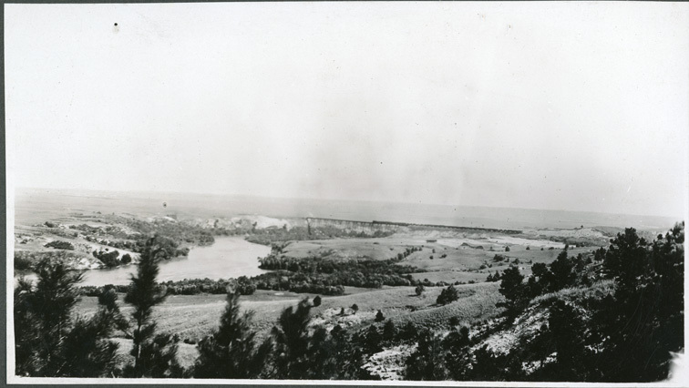 - Original caption: “Looking northeast toward Niobrara bridge. Niobrara River in foreground” #1145. Cherry County. (320101-04095)