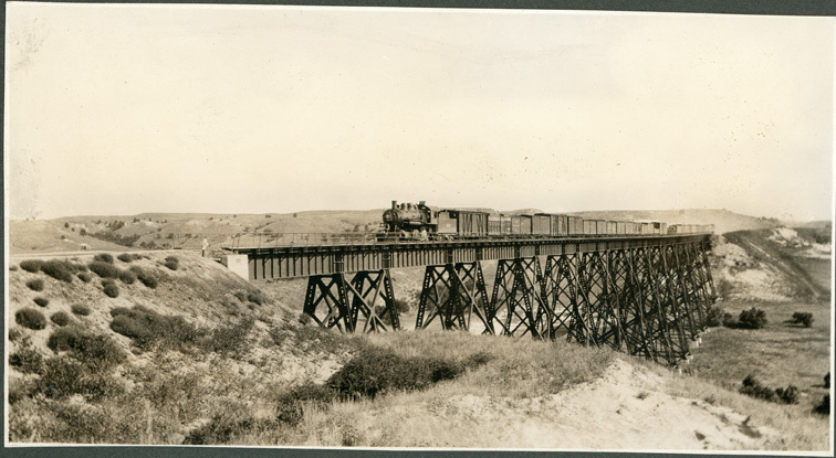 - Original caption: “Freight train coming over bridge near Valentine” #1147. Cherry County. (320101-04102)