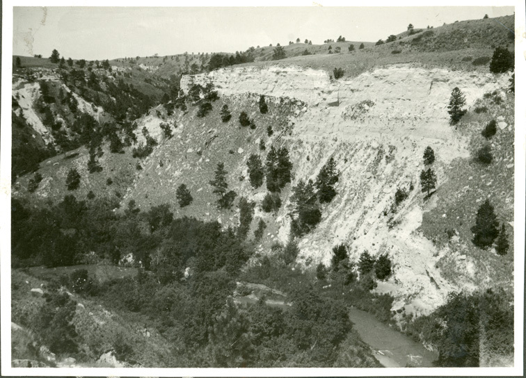 - Original caption: “General view looking up Snake River Canyon, toward Quarry where T. lulli was found. Valentine, Cherry Co.” #1315. Cherry County. 320101-4106)