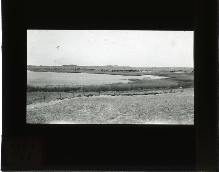 - Original caption: “Grazing in Sand Hills, 25 mi, S.E. Alliance.” Cattle grazing along lake in Sandhills. Box Butte County. (121111-00046)