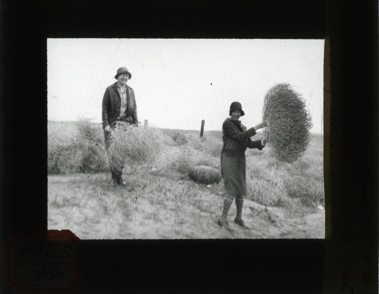 - Original caption: “4-19-30. Nebraska High Plains, Box Butte Table, tumble weeds east of Alliance.” Two women holding tumble weeds amid grass landscape. 1930. Box Butte County. (121111-00135)