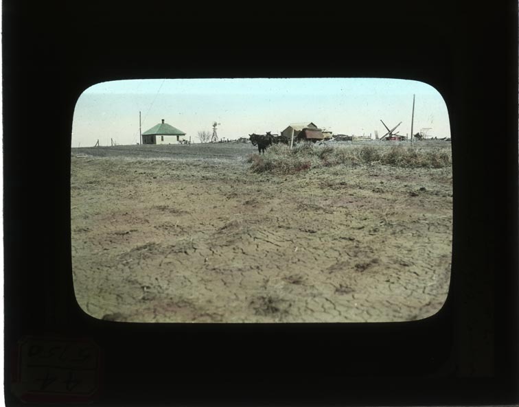 - Original caption: “Wind erosion of soil, S.E. of Alliance Apr. 4 1912 Condra.” Wagon with horses, outbuildings in background of eroded soil. Box Butte County. George Condra. (121111-00148)