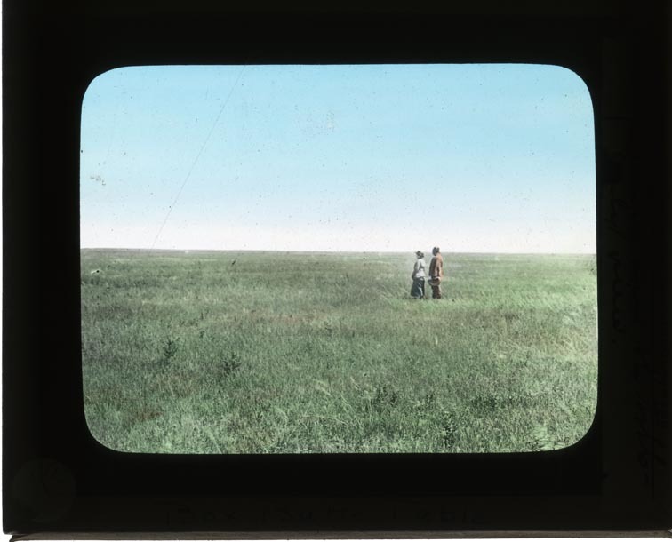 - Original caption: “Looking over the table (?) view, Box Butte Table.” A man and woman stand in open grass landscape. Box Butte County. (121111-00334)
