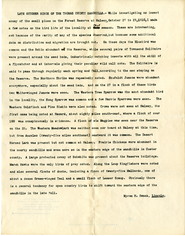Myron Swenk typescript page noted as "Late October birds of the Thomas County Sandhills."
