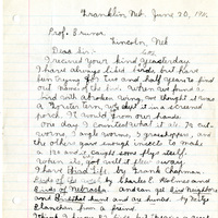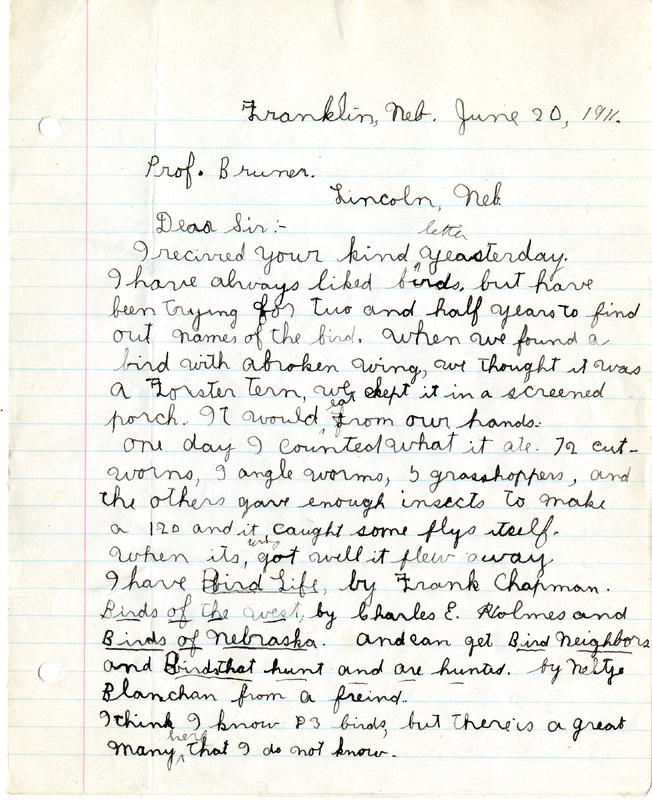 Franklin, Neb. June 20, 1911. Prof. Bruner. Lincoln, Neb. Dear Sir:- I recived your kind yeasterday. I have always liked birds, but have been trying for two and half years to find out names of the bird. When we found a bird with abroken wing, we thought it was a Forster Tern, we kept it in a screened porch. It would eat from our hands. One day I counted what it ate. 72 cutworns, 9 angle worms, 5 grasshoppers, and the others gave enough insects to make a 120 and it caught some flys itself. When its, got well it flew away. I have Bird Life by Frank Chapman Birds of the West, by Charles E. Holmes and Birds of Nebraska. And can get Bird Neighbors and Birds that hunt and are hunted by Nelly Blanchan from a freind. I think I know 83 birds, but there's a great many here that I do not know. There is a large bird here it is colar of a Purple Gracle but much larger I have not been very close to them but I have been told. they are not common, and slow in flight. There leg stick straight behind then. It is called the skypoke. I cannot find it in the books. The game warden found a nest, It was in a pile of sand with a hole in one side where there was four eggs covered with feathers. There is a little bird that acts like a wren I know the long bill marsh and western house wrens, but this has a yellow-brown color. It is very quick so quick that I can not see it good. It sing someways and scolds like a wren. It build a nest of grass weaving a hang nest seldom over three feet above the ground. It has four pure white eggs the size of a house wren but longer. When and where does the Golden Plove pass over the state? We want to know what moths and butterflys are harmless and do harm. There is a big black spidier we wish we knew more about him. he eats moths. There is a little animal the size of a rat It has not been here long they are coming fast. It has a long tail with a bunch of hair on the end. It hops on it's hind legs like a kangaroo It is called the kangroo rat Its front legs are not half as long as its hind legs. It has pockets in its cheecks. It head is like a gophers The old ones are gray and yellow What is its real name? Yours truly Charles M. Chalfon Professor Bruner Dear Sir: - Both Mr. Chalfon and myself are very grateful for your offer to direct Charlie's studies. He will be thirteen in Sept. and is in 7th grade at school. His ambition for the last year has been to "some day" be a member of the "State Bird Society." very truly, Mrs. C. E. Chalfon