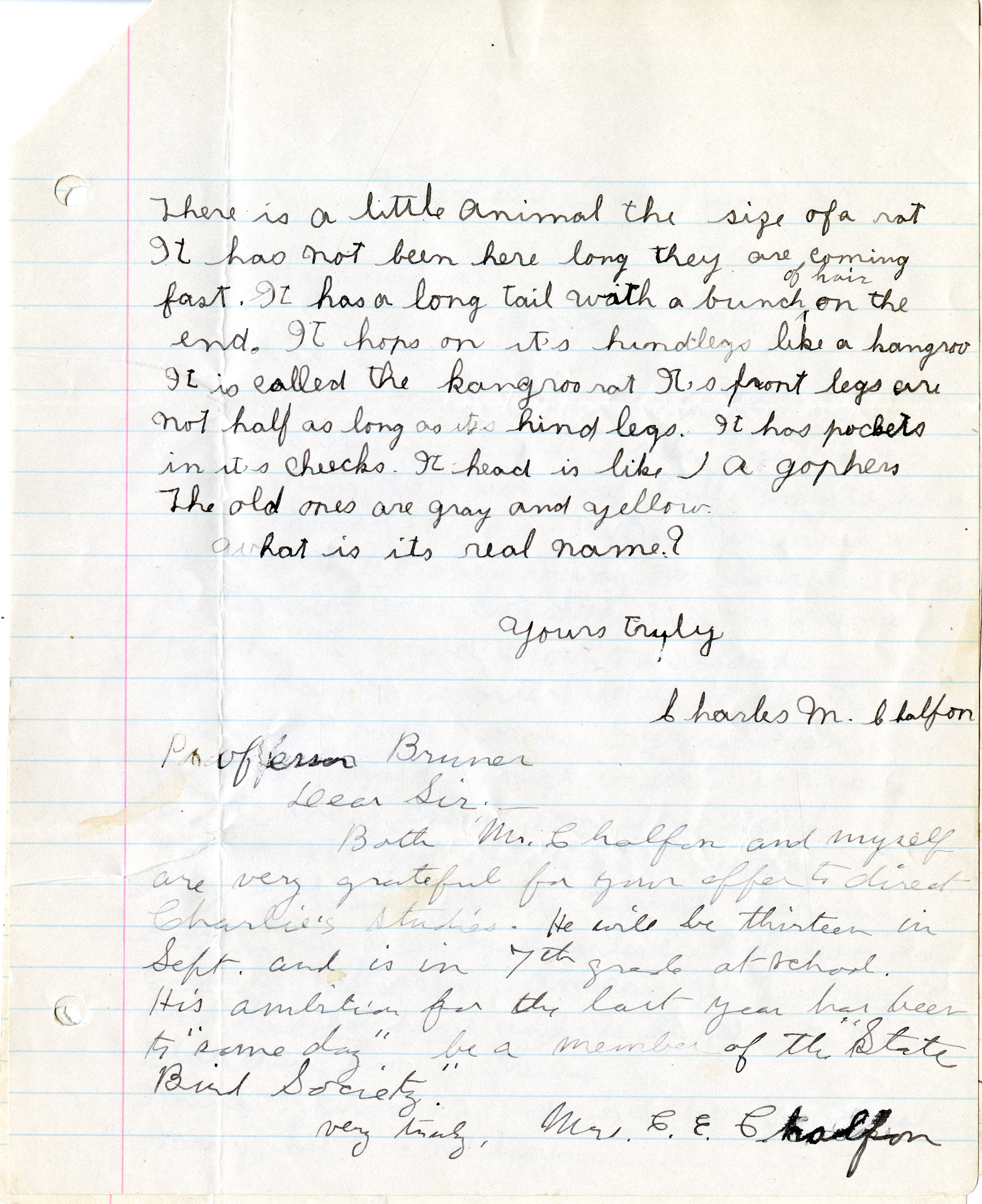 Handwritten letter from Letter from Charles M. Chalfon to "Prof. Bruner," page 1, "I receieved your kind letter.."Handwritten letter from Letter from Charles M. Chalfon to "Prof. Bruner," 3 pages, "I received your kind…"