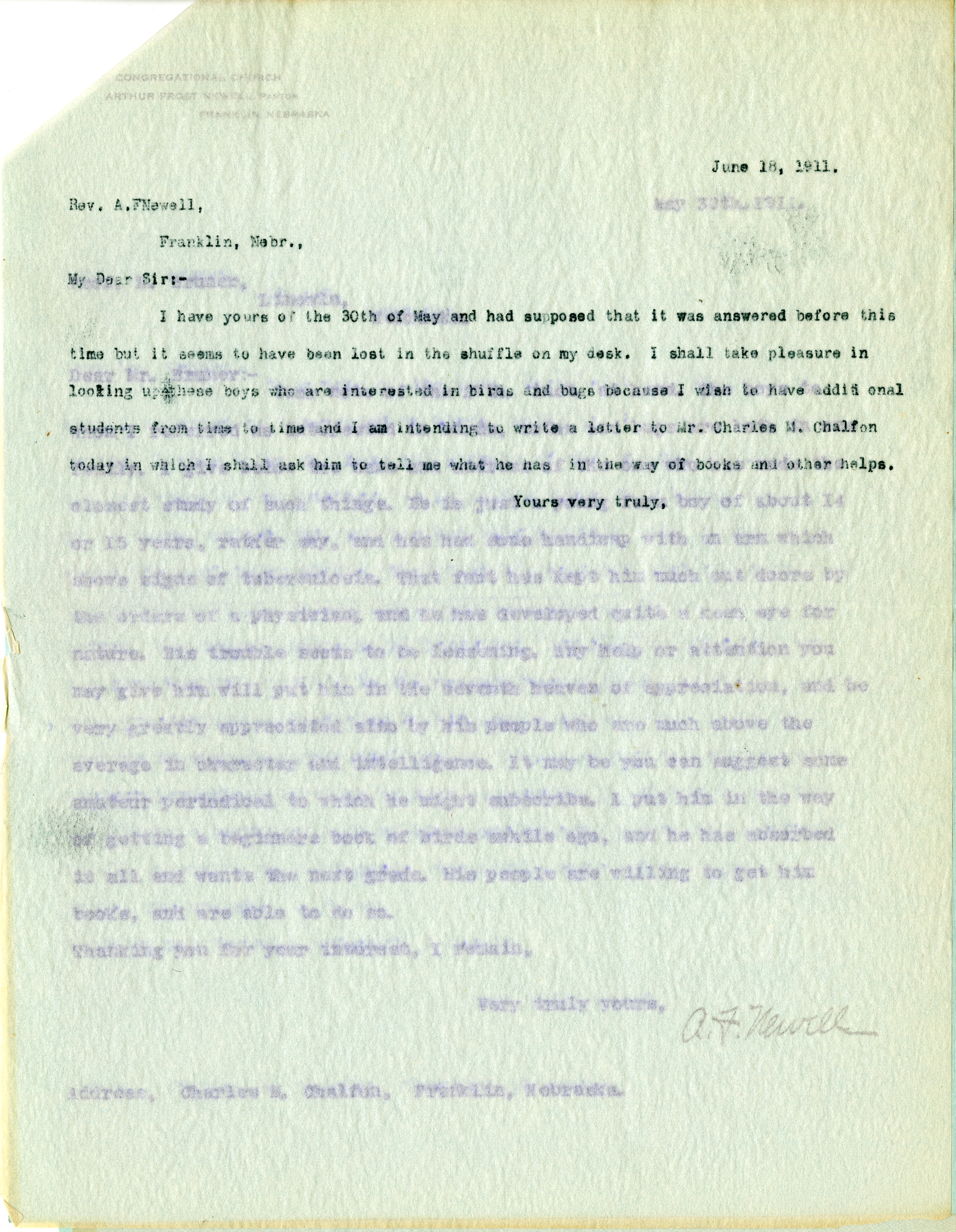 June 18, 1911 Rev. A.F. Newell Franklin, Nebr., My Dear Sir:- I have yours of the 30th of May and had supposed that it was answered before this time but it seems to have been lost in the shuffle on my desk. I shall take pleasure in looking up these boys who are interested in birds and bugs because I wish to have additional students from time to time and I am intending to write a letter to Mr. Charles M. Chalfon today in which I shall ask him to tell me what he has in the way of books and other helps. Yours very truly,