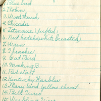 identified on June 20 by Mrs. Hole, Miss Holly, Mrs. Worden, Mrs. Richardson and Callaway sisters. 1 Blue bird 2. Robin 3. Wood thrush 4. Chicadee 5. Titmouse (tufted) 6. Nuthatch (white breasted) 7. Wren 8. Thrasher 9. Cat Bird 10. Mocking B. 11. Red start 12. Kentucky Warbler 13. Maryland yellow throat 14. Bell Vireo 15. Warbling Vireo 16. Red-eye Vireo 17. Shrike 18. Bank Swallow