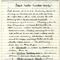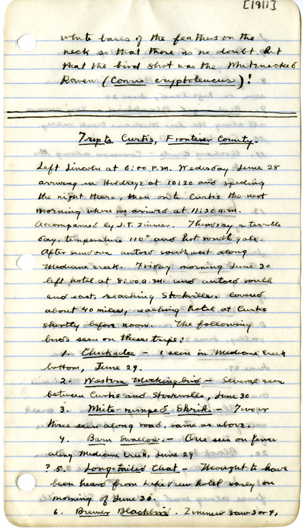 [1911] white bars of the feathers on the neck so that there is no doubt but that the bird shot was the Whitenecked Raven (Corvis cryptoleucus)! Trip to Curtis, Fronteier County. Left Lincoln at 6:00 p.m. Wednesday June 28 arriving in Holdrege at 10:20 and speding the night there, then on to Curtis the next morning where we arrived at 11:30 a.m. Accompanied by J. T. Zimmer. Thursday, a terrible day, temperature 110 degrees and hot south gale. After sundown autoed southwest along Medicine Creek. Friday morning June 30 left hotel at 8:00 a.m. and autoed south and east, reaching Stockville. Covered about 40 miles, reaching hotel at Curtis shortly before noon. The following birds seen on these trips: 1. Chickadee - 1 seen in Medicine Creek bottom, June 29. 2. Western Mockinbird - Several seen between Curtis and Stockville, June 30. 3. White-rumped Skrike - 7 woar twice seen along road, same as above. 4. Barn Swallow.- One seen on fence along Medicine Creek, June 29. ?5. Long-tailed Chat - Thought to have been heard from Lake View hotel early on morning of June 30. 6. Brewer Blackbird. Zimmer saw 3 or 4,
