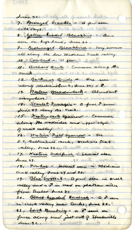 June 30. 7. Bronzed Grackle - A few seen both days. 8. Yellow-headed Blackbird - One seen on high land, June 30. 9. Redwinged Blackbird - Very common all along the low Medicine Creek valley. 10. Cowbird - A few. 11. Orchard Oriole - Common along the creek. 12. Baltimore Oriole - One seen along Medicine Creek, June 30, a male. 13. Western Meadowlark - Abundant everywhere. 14. Scarlet Tanager - A fine male seen June 29 along the creek. 15. Western Lark Sparrow - Common along the roadsides and upper edges of creek valley. 16. Western Field Sparrow - On D. C. Ballantine's ranch, Medicine Creek valley, June 30. 17. Western Goldfinch - Several seen June 29. 18. Towhee - Several seen in Medicine Creek valley June 29 and 30. 19. Blue Grosbeak - A pair seen in creek valley and a male in road on plateau miles from timber June 30. 20. Black-headed Grosbeak - A male seen in creek valley near Curtis, June 30. 21. Lark Bunting - a male seen on fence along road just out of Stockville June 30.