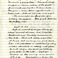 [1911] Sept. 11 - 1911 - Left Lincoln at 7:15 and arrived at Geneva at 9:00 am. Drove at once with Mr. Brown to the nurseries. Examined first a smaller field, then the propagating field and finally the apple field of thousands of young trees. Was particularly careful in examination of the field from which was reported Putnan Scale this year. Some leaves affected with Cedar rust. Returned to Lincoln same night. The inundated corn field saw five Solitary Sandpipers. One fine male Redtailed Hawk flew over. Sept. 12 - 1911 Left Lincoln at 9:40 for Fairbury where arrived at noon and inspected Galbraith and Fairbury nurseries in the P.M. Stock not nearly as good as at Geneva but no dangerous pests there. Cedar rust prevalent on apple and powdery mildew abundant on cherry and plum. Harburt's stuff on low land particularly poor, better on the hill. Left for Beatrice in the evening where arrived at 9: P.M. Barn swallows thick on the telegraph wires. Sept. 13 - 1911 Inspected Sonderregger's German Nursery in the morning. Stuff fair, better than at Fairbury. Roses had Black spot (Actinonema rosae). Saw a Cooper Hawk and other ordinary birds only.