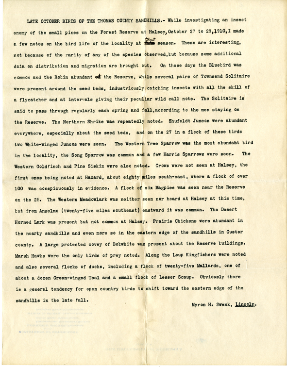 Typescript field notes, page 12, Myron Swenk bird observations on trip to Halsey and Thomas Counties in Nebraska, along entries from Lincoln, Nebraska