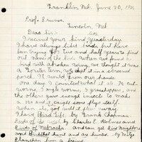 Franklin, Neb. June 20, 1911. Prof. Bruner. Lincoln, Neb. Dear Sir:- I recived your kind yeasterday. I have always liked birds, but have been trying for two and half years to find out names of the bird. When we found a bird with abroken wing, we thought it was a Forster Tern, we kept it in a screened porch. It would eat from our hands. One day I counted what it ate. 72 cutworns, 9 angle worms, 5 grasshoppers, and the others gave enough insects to make a 120 and it caught some flys itself. When its, got well it flew away. I have Bird Life by Frank Chapman Birds of the West, by Charles E. Holmes and Birds of Nebraska. And can get Bird Neighbors and Birds that hunt and are hunted by Nelly Blanchan from a freind. I think I know 83 birds, but there's a great many here that I do not know. There is a large bird here it is colar of a Purple Gracle but much larger I have not been very close to them but I have been told. they are not common, and slow in flight. There leg stick straight behind then. It is called the skypoke. I cannot find it in the books. The game warden found a nest, It was in a pile of sand with a hole in one side where there was four eggs covered with feathers. There is a little bird that acts like a wren I know the long bill marsh and western house wrens, but this has a yellow-brown color. It is very quick so quick that I can not see it good. It sing someways and scolds like a wren. It build a nest of grass weaving a hang nest seldom over three feet above the ground. It has four pure white eggs the size of a house wren but longer. When and where does the Golden Plove pass over the state? We want to know what moths and butterflys are harmless and do harm. There is a big black spidier we wish we knew more about him. he eats moths. There is a little animal the size of a rat It has not been here long they are coming fast. It has a long tail with a bunch of hair on the end. It hops on it's hind legs like a kangaroo It is called the kangroo rat Its front legs are not half as long as its hind legs. It has pockets in its cheecks. It head is like a gophers The old ones are gray and yellow What is its real name? Yours truly Charles M. Chalfon Professor Bruner Dear Sir: - Both Mr. Chalfon and myself are very grateful for your offer to direct Charlie's studies. He will be thirteen in Sept. and is in 7th grade at school. His ambition for the last year has been to "some day" be a member of the "State Bird Society." very truly, Mrs. C. E. Chalfon