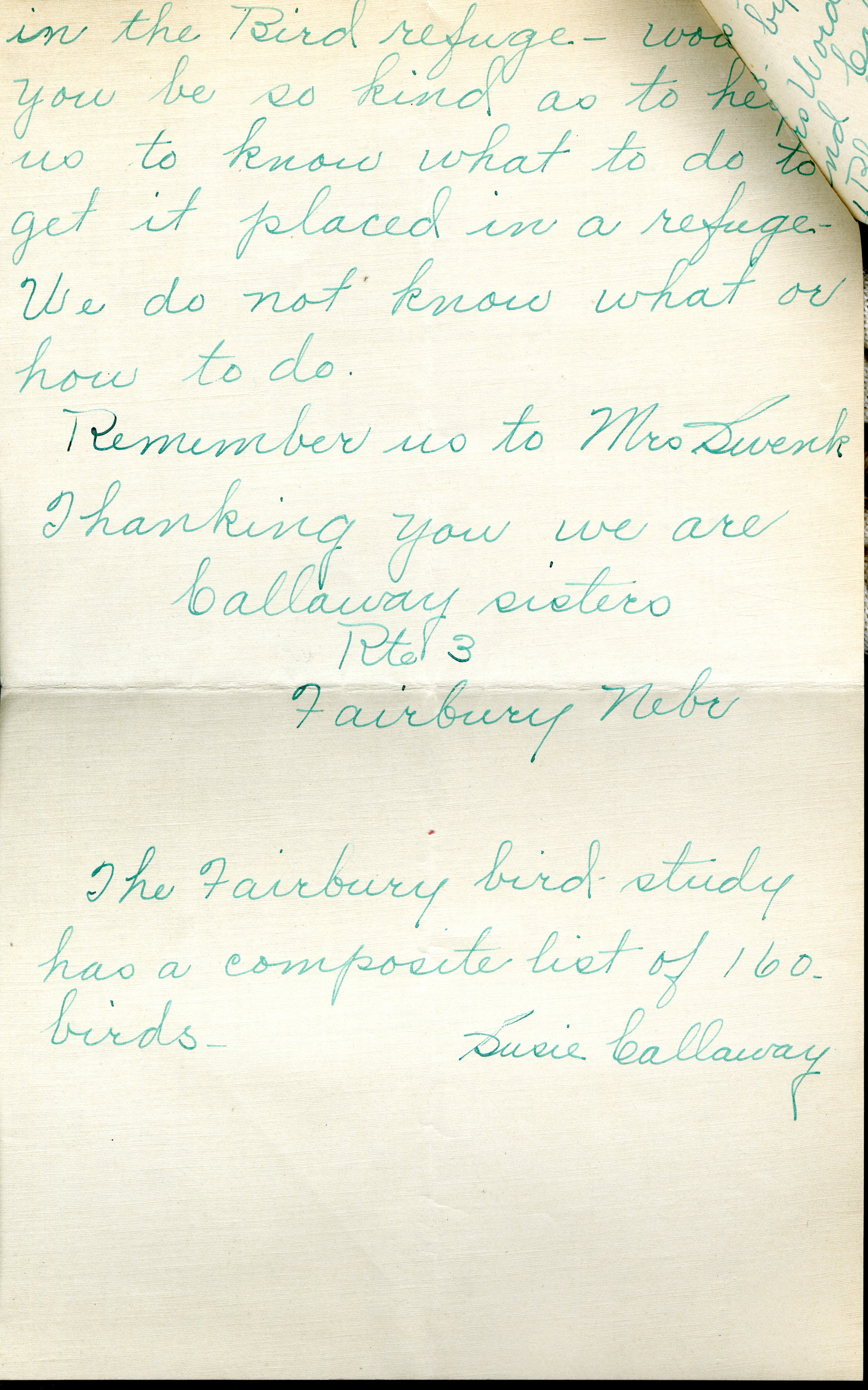 in the Bird refuge - wo you be so kind as to he us to know what to do to get it placed in a refuge. We do not know what or how to do. Remember us to Mrs. Swenk Thanking you we are Callaway sisters Rte 3 Fairbury Nebr