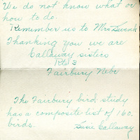 Handwritten letter, 5 pages, from Susie Callaway to Myron H. Swenk,"I am sending you a list of birds…"