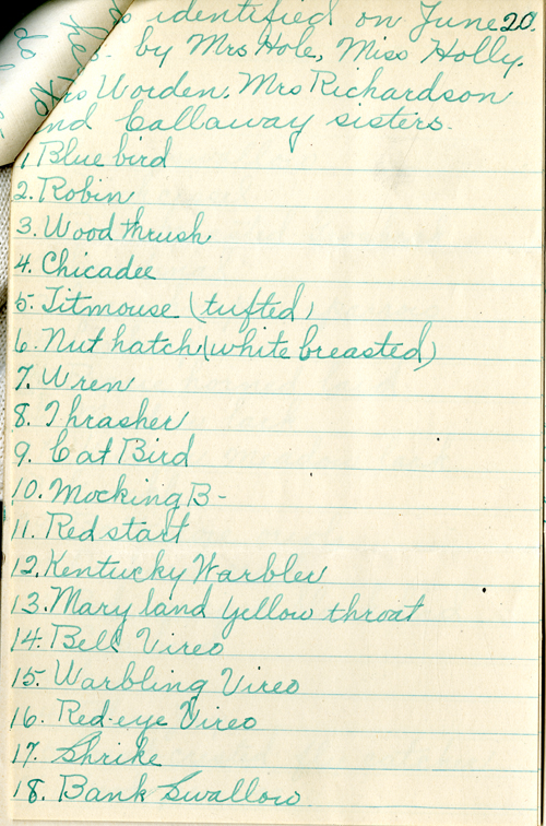 identified on June 20 by Mrs. Hole, Miss Holly, Mrs. Worden, Mrs. Richardson and Callaway sisters. 1 Blue bird 2. Robin 3. Wood thrush 4. Chicadee 5. Titmouse (tufted) 6. Nuthatch (white breasted) 7. Wren 8. Thrasher 9. Cat Bird 10. Mocking B. 11. Red start 12. Kentucky Warbler 13. Maryland yellow throat 14. Bell Vireo 15. Warbling Vireo 16. Red-eye Vireo 17. Shrike 18. Bank Swallow