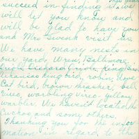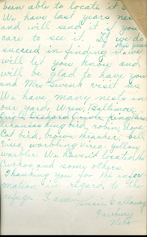 been able to locate it We have last years nest and will send it if you care to see it. If we do succeed in finding it this year we will let you know and will be glad to have you and Mrs. Swenk visit us. We have many nests in our yard. Wren, Baltimore Oriole, Orchard Oriole, King Bird, Arkansas king bird, robin, dove, Cat bird, brown thrasher, bell Viero, warbling vireo - yellow warbler. We haven't located the Cuckoo and some others. Thanking you for the information in regard to the refuge I am Susie Callaway Fairbury, Nebr.