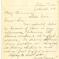 JUL 30 Ansd Utica, Nebr. July 22, 03 Prof Bruner, State Uni. Dear Sir: We would like to know if there is any difference between the prairie chicken & the ruffed grouse. Do prairie chickens have feathers on their legs. Is prairie chicken a nick name for ruffed grouse. Hoping to hear soon. Truly Yours Marion Nelson
