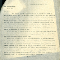 Lincoln, Nebr., Mch. 26, 1906. Gene Stratton-Porter Geneva, Ind. Dear Madam:- I have recently received a communication from Mr. and Mrs. N. C. Dunlap of Watson's Ranch, Kearney, Nebr. in which they speak of the Flanklins gull as a grasshopper destroyer and incidentally inform me that you had expressed your intention of preparing an article on this topic. I wish to say that I myself have on several occasions seen this same gull in the alfalfa fields in the vicinity of Kearney and Gothenburg, where they had congregated for the purpose of feeding upon grasshoppers. It is a well known fact to field ornithologists that these birds along with a number of other related species are very partial to grasshoppers and crickets as food. In early days when the Mormans settled in the Salt Lake valley of Utah and the crickets came from the mountains and devastated their crops, the gulls came from the islands of the lake, fell upon the crickets and devoured them. Several years ago while I was in the Argentine Republic for the purpose of studying the migratory locusts of that country, a very common sight was the imense flocks of gulls that came inland for the purpose of feeding upon these insects. It was claimed that after feeding themselves to the utmost with the insects, the birds would fly to the water regurgitate the insects and start out for another meal, keeping this up throughout the day. Mr. Dunlap also speaks of a migration of hawks while you were their guest. These hawks were no doubt the bird known as Swainson's hawk, one of our common plains birds which migrate in flocks. It also is known as a destroyer of grasshoppers. Yours very truly,