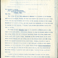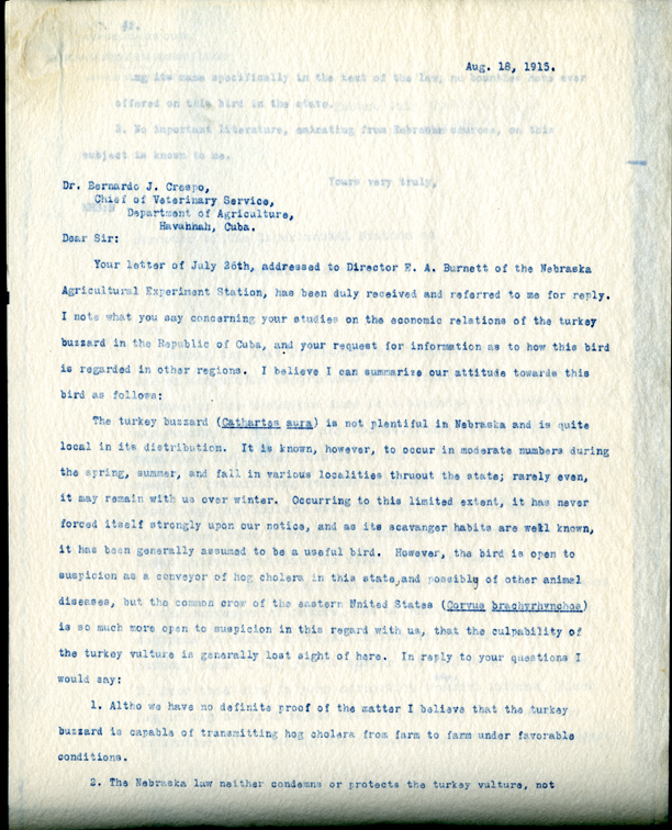 Aug. 18, 1915. Dr. Bernardo J. Crespo, Chief of Veterinary Service, Department of Agriculture, Havannah, Cuba. Dear Sir: Your letter of July 26th, addressed to Director E. A. Burnett of the Nebraska Agricultural Experiment Station, has been duly received and referred to me for reply. I note what you say concerning your studies on the economic relations of the turkey buzzard in the Republic of Cuba, and your request for information as to how this bird is regarded in other regions. I believe I can summarize our attitude towards this bird as follows: The turkey buzzard (Cathartes aura) is not plentiful in Nebraska and is quite local in its distribution. It is known, however, to occur in moderate numbers during the spring, summer, and fall in various localities thruout the state; rarely even, it may remain with us over winter. Occurring to this limited extent, it has never forced itself strongly upon our notice, and as its scavenger habits are well known, it has been generally assumed to be a useful bird. However, the bird is open to suspicion as a conveyor of hog cholera in this state, and possibly of other animal diseases, but the common crow of the eastern United States (Corvus brachyrhynchos) is so much more open to suspicion in this regard with us, that the culpability of the turkey vulture is generally lost sight of here. In reply to your questions I would say: 1. Altho we have no definite proof of the matter I believe that the turkey buzzard is capable of transmitting hog cholera from farm to farm under favorable conditions. 2. The Nebraska law neither condemns or protects the turkey vulture, not