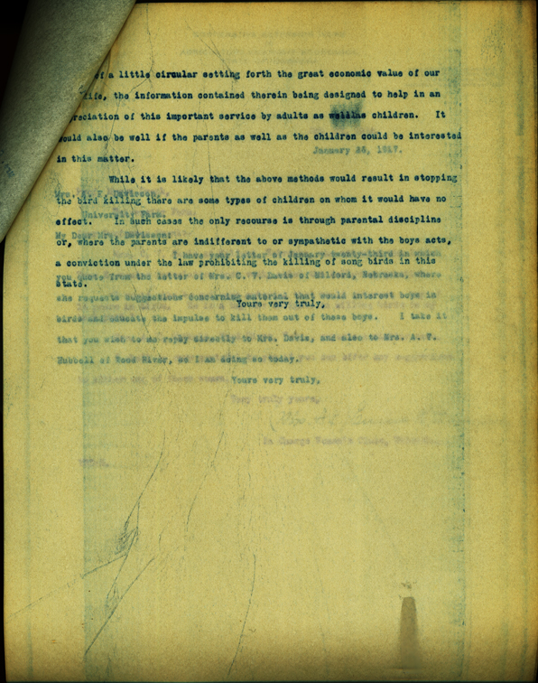 a little circular setting forth the great economic value of our life, the information contained therein being designed to help in an appreciation of this important service by adults as well as children. It would also be well if the parents as well as the children could be interested in this matter. While it is likely that the above methods would result in stopping the bird killing there are some types of children on whom it would have no effect. In such cases the only recourse is through parental discipline or, where the parents are indifferent to or sympathetic with the boys acts, a conviction under the law prohibiting the killing of song birds in this state. Yours very truly,