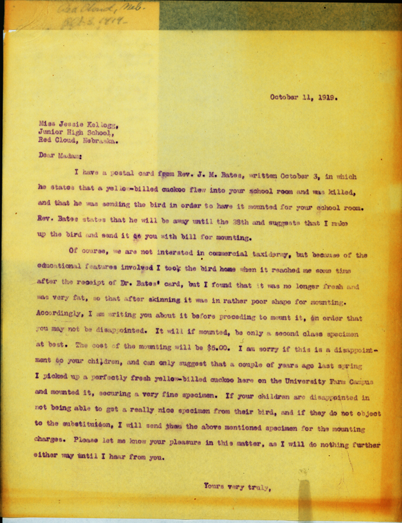 October 11, 1919. Miss Jessie Kellogg, Junior High School, Red Cloud, Nebraska. Dear Madam: I have a postal card from Rev. J. M. Bates, written October 3, in which he states that a yellow-billed cuckoo flew into your school room and was killed, and that he was sending the bird in order to have it mounted for your school room. Rev. Bates states that he will be away until the 28th and suggests that I make up the bird and send it to you with bill for mounting. Of course, we are not interested in commercial taxidermy, but because of the educational features involved I took the bird home when it reached me some time after the receipt of Dr. Bates' card, but I found that it was no longer fresh and was very fat, so that after skinning it was in rather poor shape for mounting. Accordingly, I am writing you about it before proceding to mount it, in order that you may not be disappointed. It will if mounted, be only a second class specimen at best. The cost of mounting will be $5.00. I am sorry if this is a disappointment to your chidlren, and can only suggest that a couple of years ago last spring I picked up a perfectly fresh yellow-billed cuckoo here on the University Farm Campus and mounted it, securing a very fine specimen. If your chidren are disappointed in not being able to get a really nice specimen from their bird, and if they do not object to the substitution, I will send them the above mentioned specimen for the mounting charges. Please let me know your pleasure in this matter, as I will do nothing further either way until I hear from you. Yours very truly,