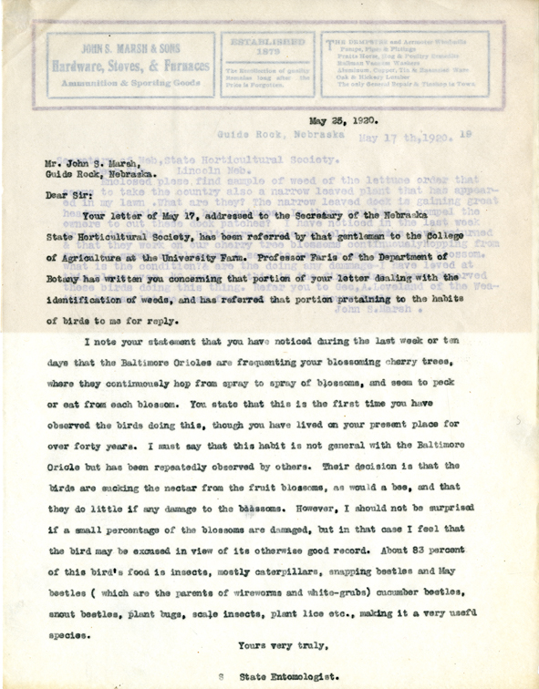 May 28, 1920. Mr. John S. Marsh, Guide Rock, Nebraska. Dear Sir: Your letter of May 17, addressed to the Secretary of the Nebraska State Horticultural Society, has been referred by that gentleman to the College of Agriculture at the University Farm. Professor Faris of the Department of Botany has written you concerning that portion of your letter dealing with the identification of weeds, and has referred that portion pretaining to the habits of birds to me for reply. I note your statement that you have noticed during the last week or ten days that the Baltimore Orioles are frequenting your blossoming cherry trees, where they continuously hop from spray to spray of blossoms, and seem to peck or eat from each blossom. You state that this is the first time you have observed the birds doing this though you have lived on your present place for over forty years. I must say that this habit is not general with the Baltimore Oriole but has been repeatedly observed by others. Their decision is that the birds are sucking the nectar from the fruit blossoms, as would a bee, and that they do little if any damage to the blossoms. However, I should not be surprised if a small percentage of the blossoms are damaged, but in that case I feel that the bird may be excused in view of its otherwise good record. About 83 percent of this bird's food is insects, mostly caterpillars, snapping beetles and May beetles ( which are the parents of wireworms and white-grubs) cucumber beetles, snout beetles, plant bugs, scale insects, plant lice etc., making it a very useful species. Yours very truly, State Entomologist.