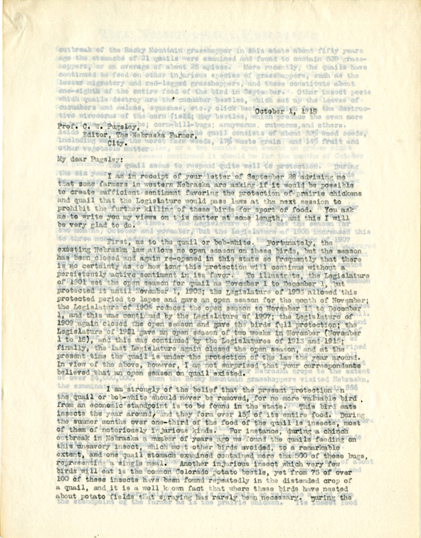 October 1, 1915 Prof. C. W. Pugsley, Editor, The Nebraska Farmer, City. My dear Pugsley: I am in receipt of your letter of September 26 advising me that some farmers in western Nebraska are asking if it would be possible to create sufficient sentiment favoring the protection of prairie chickens and quail that the Legislature would pass laws at the next session to prohibit the further killing of these birds for sport or food. You ask me to write you my views on this matter at some length, and this I will be very glad to do. First, as to the quail or bob-white. Fortunately, the existing Nebraska law allows no open season on these birds, but the season has been closed and again re-opened in this state so frequently that there is no certainty as to how long this protection will continue without a persistently active sentiment in its favor. To illustrate, the Legislature of 1901 set the open season for quail as November 1 to December 1, but protected it until November 1, 1903; the Legislature of 1903 allowed this protected period to lapse and gave an open season for the month of November; the Legislature of 1905 reduced the open season to November 15 to December 1, and this was continued by the Legislature of 1907; the Legislature of 1909 again closed the open season and gave the birds full protection; the Legislature of 1911 gave an open season of two weeks in November (November 1 to 16), and this was continued by the Legislatures of 1913 and 1915; finally, the last Legislature again closed the open season, and at the preent time the quail is under the protection of the law the year around. In view of the above, however, I am not surprised that your correspondents believed that an open season on quail existed. I am strongly of the belief that the present protection on the quail or bob-white should never be removed, for no more valuable bird, from an economic standpoint is to be found in the state. This bird eats insects the year around, and they form over 15% of its entire food. During the summer months over one-third of the food of the quail is insects, most of them of notoriously injurious kinds. For instance, during a chinch outbreak in Nebraska a number of years ago we found the quails feeding on this unsavory insect, which most other birds avoided, to a remarkable extent, and one quail stomach examined contained more than 500 of these bugs, representing a single meal. Another injurious insect which very few birds will eat is the common Colorado potato beetle, yet from 75 of over 100 of these insects have been found repeatedly in the distended crop of a quail, and it is a well known fact that where these birds have nested about potato fields that spraying has rarely been necessary. During the