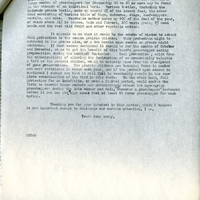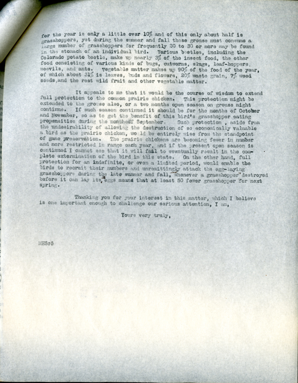 for this year is only a little over 10% and of this only about half is grasshoppers, yet during the summer and fall these grouse must consume a large number of grasshoppers for frequently 20 to 30 or more may be found in the stomach of an individual bird. Various beetles, including the Colorado potato beetle, make up nearly 3% of the insect food, the other food consisting of various kinds of bugs, cutworms, slugs, leaf-hoppers, weevils, and ants. Vegetable matter makes up 90% of the food of the year, of which about 31% is leaves, buds and flowers, 20% waste grain, 7% weed seeds, and the rest wild fruit and other vegetable matter. It appeals to me that it would be the course of wisdom to extend full protection to the common prairie chicken. This protection might be extended to the grouse also, or a two months open season on grouse might continue. If such season continued it should be for the months of October and November, so as to get the benefit of this bird's grasshopper eating propensities during the month of September. Such protection, aside from the undesirability of allowing the destruction of so economically valuable a bird as the prairie chicken, would be entirely wise from the standpoint of game preservation. The prairie chickens are becoming fewer in number and more restricted in range each year, and if the present open season is continued I cannot see that it will fail to eventually result in the complete extermination of the bird in this state. On the other hand, full protection for an indefinite, or even over a limited period, would enable the birds to recruit their numbers and unremittingly attack the egg-laying grasshoppers during the late summer and fall. Whenever a grasshopper destroyed before it can lay its eggs means that at least 50 fewer grasshopper for next spring. Thanking your for your interest in this matter, which I believe is one important enough to challenge our serious attention, I am, Yours very truyly, MHS:G