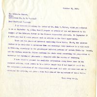 October 30, 1919. The Nebraska Farmer, City. (Attention Mr. C. W. Pugsley) Dear Professor Pugsley: I am herewith returning the letter of Mr. John W. Talbot, which you referred to me on September 26, asking that I prepare an article of use and interest to the readers of the Nebraska Farmer on the Chinese ring-necked pheasant. On September 27 I wrote you that I would prepare such an article at the first opportunity. There are two phases of interest concerning these birds. First, the question whether it is desirable to introduce them and encourage their increase in a wild state in Nebraska, especially in the grasshopper infested portions of western Nebraska. Second. are the virtues which Mr. Talbot mentions the whole story concerning the proposition to encourage the raising of pheasants as compared with the raising of chickens. I have tried to present the available information along these lines in the enclosed article, which proves to be a little longer than I had hoped it would be. The enclosed illustration of the ring-necked pheasant will make and excellent cut to accompany the article, and gives a very fair idea of the appearance of these birds. Yours very truly,