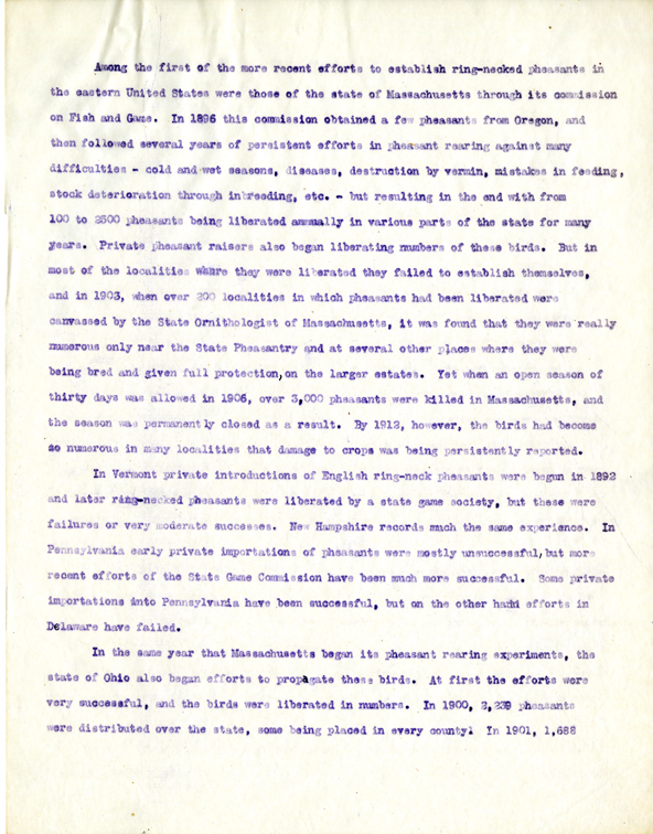 Typewritten enclosed article, 11 pages, titled "The Economic Value of the Ring-Necked Pheasant."