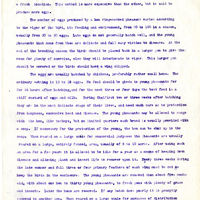 downsloping shelf for protection from storm and sun. A brush pile is kept in each pen. When the grass in a pen is used up and fouled the pens are dragged forward to a fresh location. This method is more expensive than the other, but is said to produce more eggs. The number of eggs produced by a hen ring-necked pheasant varies according to the vigor of the bird, its feeding and environment, from 30 to 100 in a season, usually from 30 to 50 eggs. Late eggs do not generally hatch well, and the young pheasants that come from them are delicate and fall easy victims to disease. At the end of the breeding season the birds should be placed back in a larger pen to give them room for plenty of exercise, else they will deteriorate in vigor. This larger pen should be covered or the birds should have a wing clipped. The eggs are usually hatched by chickens, preferably rather small hens. The ordinary setting is 15 to 18 eggs. No food shold be given to young pheasants for for 24 hours after hatching, and for the next three or four days the best food is a stiff custard of eggs and milk. During that first two or three weeks after hatching they are in the most delicate stage of their lives, and need much care as to protection from dampness, excessive heat and disease. The young pheasants may be allowed to range with the hen, like turkeys, but on limited quarters each brood is usually provided with a coop. If necessary for the protection of the young, the hen can be shut up in the coop. When reared on a large scale for commercial purposes the pheasants are usually reared on a large, entirely fenced, area, usually of 5 to 10 acres. After using such an area for a few years it is allowed to be idle for a year as a means of keeping down disease and allowing plant and insect life to recover upon it. Every three weeks during the late summer and fall three or four primary feathers of each wing must be cut to keep the birds in the enclosure. The young pheasants are removed when about five weeks old, with about one hen to thirty young pheasants, to fresh pens with plenty of grass and insects. Later the hens are removed. If any batch does poorly it is promptly removed to another pen. When reared on a large scale for purposes of distribution for stocking as game-birds, the hen and young are usually allowed free range all over the place. The birds return at night to feed, even when they have left the hens and range