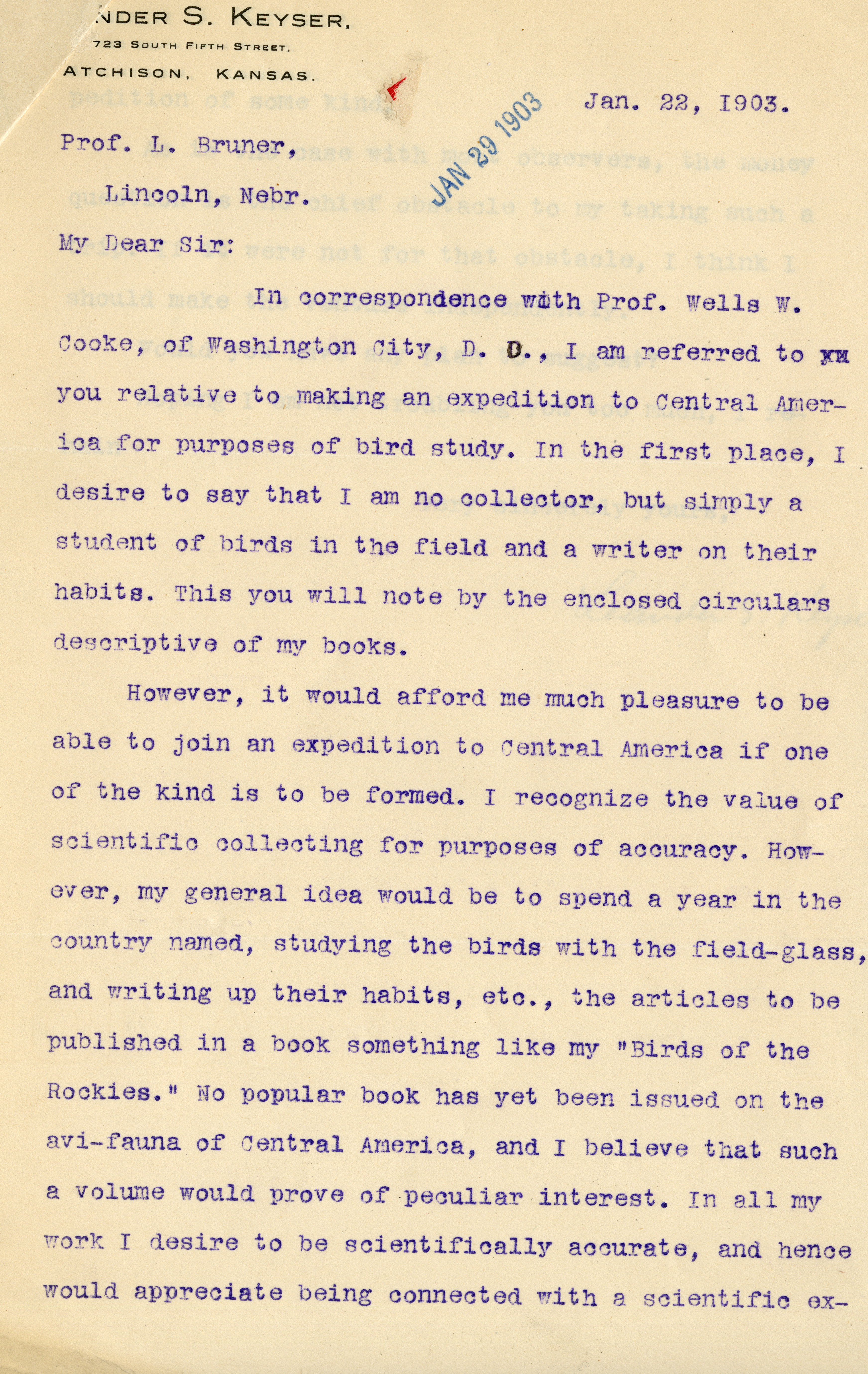 Keyser. 723 South Fifth Street. Atchison, Kansas. Jan 29, 1903 Jan. 22, 1903. My Dear Sir: In correspondence with Prof. Wells W. Cooke, of Washington City, D. C., I am referred to you relative to making an expedition to Central America for purposes of bird study. In the first place, I desire to say that I am no collector, but simply a student of birds in the field and a writer on their habits. This you will note by the enclosed circulars descriptive of my books. However, it would afford me much pleasure to be able to join an expedition to Central America if one of the kind is to be formed. I recognize the value of scientific collecting for purposes of accuracy. However, my general idea would be to spend a year in the countrty named, studying the birds with the field-glass, and writing up their habits, etc., the articles to be published in a book something like my "Birds of the Rockies." No popular book has yet been issued on the avi-fauna of Central America, and I believe that such a volume would prove of peculiar interest. In all my work I desire to be scientifically accurate, and hence would appreciate being connected wth a scientific ex-