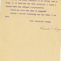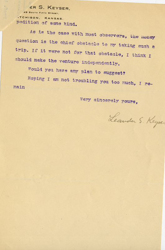pedition of some kind. As is the case with most observers, the money question is the chief obstacle to my taking such a trip. If it were not for that obstacle, I think I should make the venture independently. Would you have any plan to suggest? Hoping I am not troubling you too much, I remain Very sincerely yours, Leander S. Keyser