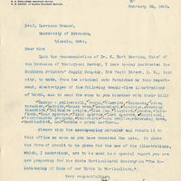 U. S. Department of Agriculture Division of Publications Washington, D. C. H. C. Geo. Wm. Hill, Editor and Chief. Jos. A. Arnold, Associate Editor. B. D. Stallings, Assistant Editor. R. B. Handy, In Charge Document Section. Feb 28 Rec'd March 5 Ans'd February 25, 1903. Prof. Lawrence Bruner, University of Nebraska, Lincoln, Nebr. Dear Sir: Upon the recommendation of Dr. C. Hart Merriam, Chief of the Division of Biological Survey, I have to-day instructed the Southern Printers' Supply Company, 304 Tenth Street, N. W., this city, to make, from the original cuts furnished by this Department, electrotypes of the following twenty-five illustraitons of birds, and to send the same to you together with their bill: Cuckoo - yellow-bill, robin, bluebird, chicadee, brown thrasher, catbird, house wren, meadowlark, bobolink, redwing blackbird, Baltimore oriole, blue jay, kingbird, phoebe, goldfinch, song sparrow, field sparrow, lark sparrow, dickcissel, mockingbird, and shrike - great northern. Please sign the accompanying circular and return it to this office as soon as you have received the cuts. It shows the form of credit to be given for the use of the illustrations, which, I understand, are to be used in a special report you are now preparing for the State Horticultural Society on "The Relationship of Some of our Birds to Horticulture." Very respectfully, Geo. Wm Hill Inclosure.