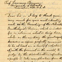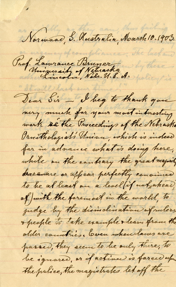 Norwood, S. Australia, March 10. 1903. Prof. Lawrance Bruner University of Nebraska Lincoln, Nebr. U. S. A. Dear Sir—I beg to thank you very much for your most interesting work in the Proceedings of the Nebraska Ornithologist's Union, which is indeed far in advance what is doing here, while on the contrary the great majority here are or appear perfectly convinced to be at least on a level (if not ahead of) with the foremost of the world, to judge by the disinclination of rulers & people to take example & learn from the older countries. Even when laws are passed, they seem to be only there, to be ignored, or if action is forced upon the pollice, the magistrates let off the