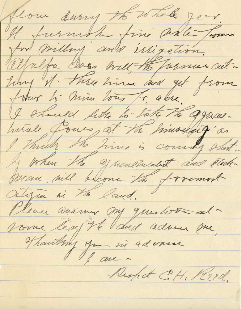 flow during the whole year. It furnishes five water towers for milling and irrigation. Alfalfa does well, the farmers cutting it three times and get from four to nine tons per acre. I should like to take the agricultural cours at the university as I think the time is coming shortly when the agriculturalist and stockman will become the foremost citizen in the land. Please answer my questions at some length and advise me. Thanking you in advance I am, [Illegible] C. H. Reed.