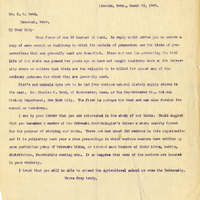 Lincoln, Nebr., March 25, 1903. Mr. C. H. Reed, Comstock, Nebr. My Dear Sir:- Your favor of the 22 instant at hand. In reply would advise you to secure a copy of some manual on taxidermy in which the methods of proceudre and the kinds of preservatives that are generally used are described. Since our new law protecting the bird life of the state was passed two years ago we have not taught taxidermy here at the University since we believe that birds are too valuable to be killed for almost any of the ordinary purposes for which they are generally used. Bird's and mammals eyes are to be had from various natural history supply stores in the east. Mr. Charles K. Reed, of Worchester, Mass. or The Kay-Scheerer Co., Natural History Department, New York City. The first is perhaps the best and can also furnish the manual on taxidermy. I see by your letter that you are interested in the study of our birds. Would suggest that you become a member of the Nebraska Ornithologist's Union- a state society formed for the purpose of studying our birds. There are now about 200 members in this organization and it is publishing each year a nice proceedings in which various members have written up some particular group of Nebraska birds, or treated some feature of their lives, habits, distribution, food-habits nesting etc. It so happens that none of the members are located in your vicinity. I trust that you will be able to attend the Agricultural school or even the Unviersity. Yours very truly,