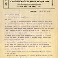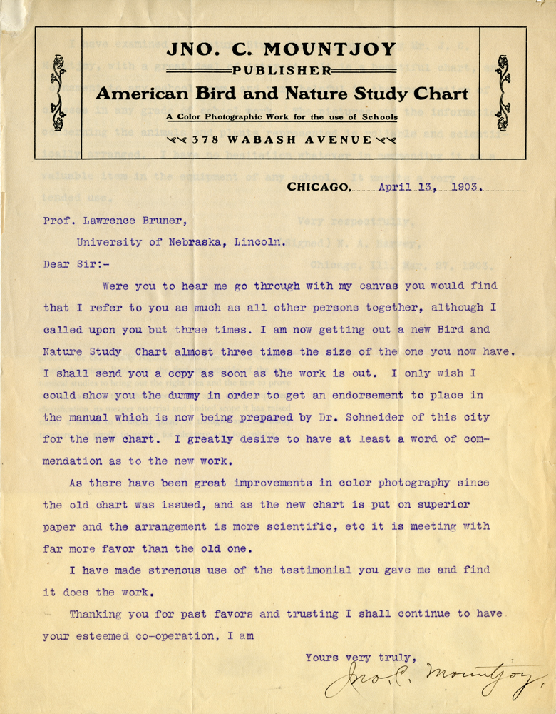 JNO. C. MOUNTJOY Publisher American Bird and Nature Study Chart A Color Photographic Work for the use of Schools 38 Wabash Avenue Chicago, April 13, 1903. Prof. Lawrence Bruner, University of Nebraska, Lincoln Dear Sir:- Were you to hear me go through with my canvas you would find that I refer to you as much as all other persons together, although I called upon you but three times. I am now getting out a new Bird and Nature Study Chart almost three times the size of the one you now have. I shall send you a copy as soon as the work is out. I only wish I could show you the dummy in order to get an endorsement to place in the manual which is now being prepared by Dr. Schneider of this city for the new chart. I greatly desire to have at least a word of commendation as to the new work. As there have been great improvements in color photography since the old chart was issued, and as the new chart is put on superior paper and the arrangement is more scientific, etc it is meeting with far more favor than the old one. I have made strenous use of the testimonial you gave me and find it does the work. Thanking you for past favors and trusting I shall continue to have your esteemed co-operation, I am Yours very truly, Jno. C. Mountjoy.