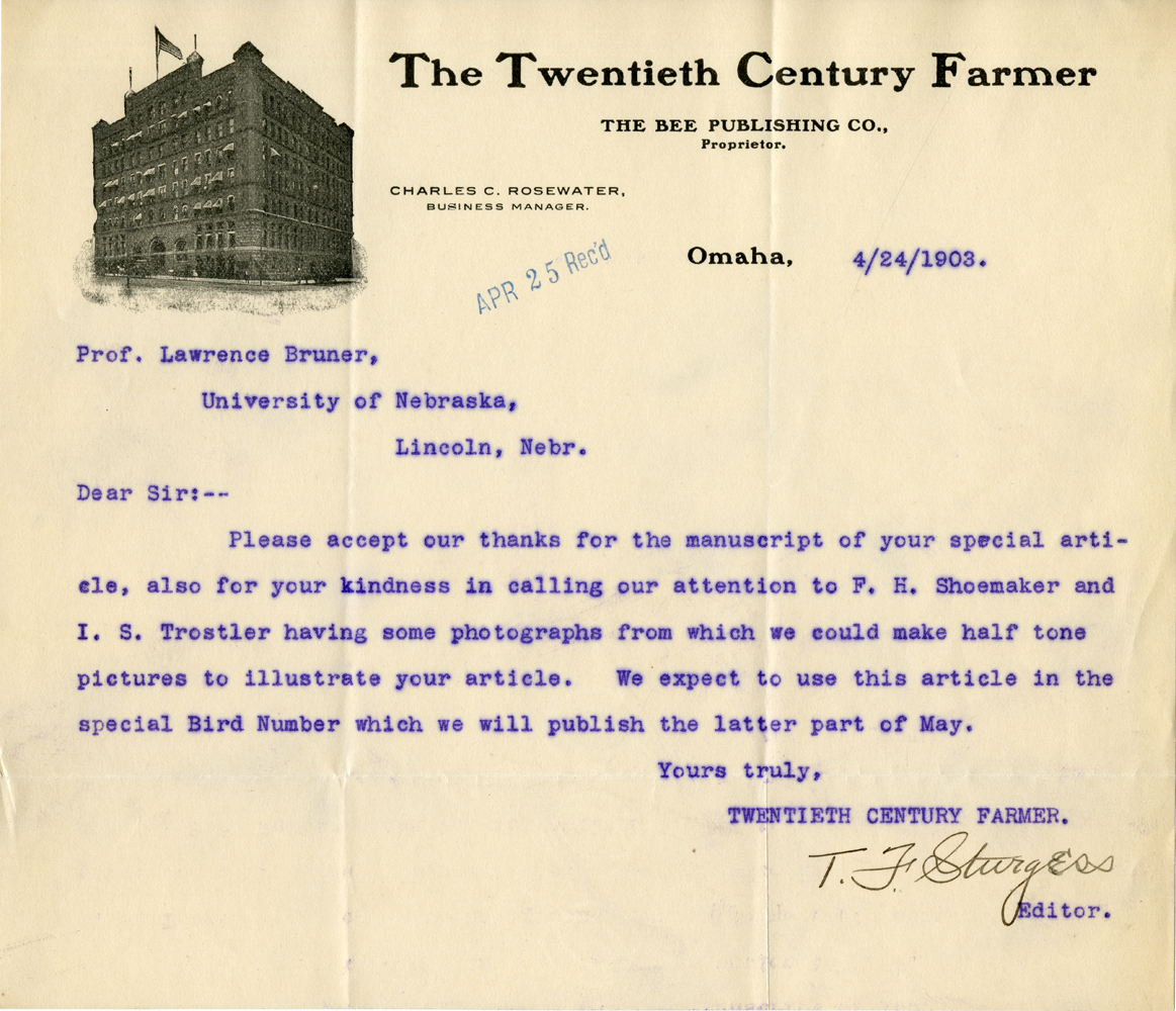 The Twentieth Century Farmer The Bee Publishing Co., Proprietor Charles S. Rosewater Business Manager Omaha, 4/24/1903. Apr 25 Rec'd Prof. Lawrence Bruner, University of Nebraska, Lincoln, Nebr. Dear Sir:-- Please accept our thanks for the manuscript of your special article, also for your kindness in calling our attention to F. H. Shoemaker and I. S. Trostler having some photographs from which we could make half tone pictures to illustrate your article. We expect to use this article in the special Bird Number which we will publish the latter part of May. Yours truly, TWENTIETH CENTURY FARMER, T. F. Sturgess Editor