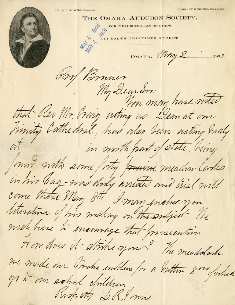 Dr. S. R. Towne, President Miss Joy Higgins, Secretary The Omaha Audubon Society, For the Protection of Birds 344 South Thirtieth Street Omaha, May 2 1903 May 4 Rec'd May 4 Ans'd Prof Bruner My Dear Sir: You may have noted that Rev. Mr. Craig acting as Dean at our Trinity Cathedral, has also been acting badly at in north part of state being found with some forty meadowlarks in his bag - was duly arrested and trial will come there May 8th. I may enclose you literature of his making on the subject. We wish here to encourage that prosecution. How does it strike you? The meadowlark we made our Omaha emblem for a letter 8000 of which go to our school children. [Illegible] S. R. Towne