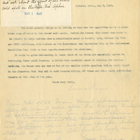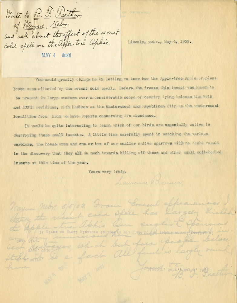 Write to B. F. Feather, of Wayne, Nebr. and ask about the effect of the recent cold spell on the Apple-tree Aphis. May 4 Ans'd Lincoln, Nebr., May 4, 1903. You would greatly oblige me by letting me know how the Apple-tree Aphis or plant louse was affected by the recent cold spell. Before the freeze this insect was known to be present in large numbers over a considerable scope of country lying between the 98th and 100th meridians, with Madison as the easternmost and Republican City as the westernmost localities from which we have reports concerning its abundance. It would be quite interesting to learn which of our birds are especially active in destroying these small insects. A little time carefully spent in watching the various warblers, the house wren and one or two of our smaller native sparrows will no doubt result in the discovery that they all do much towards killing off these and other small soft-bodied insects at this time of the year. Yours very truly,